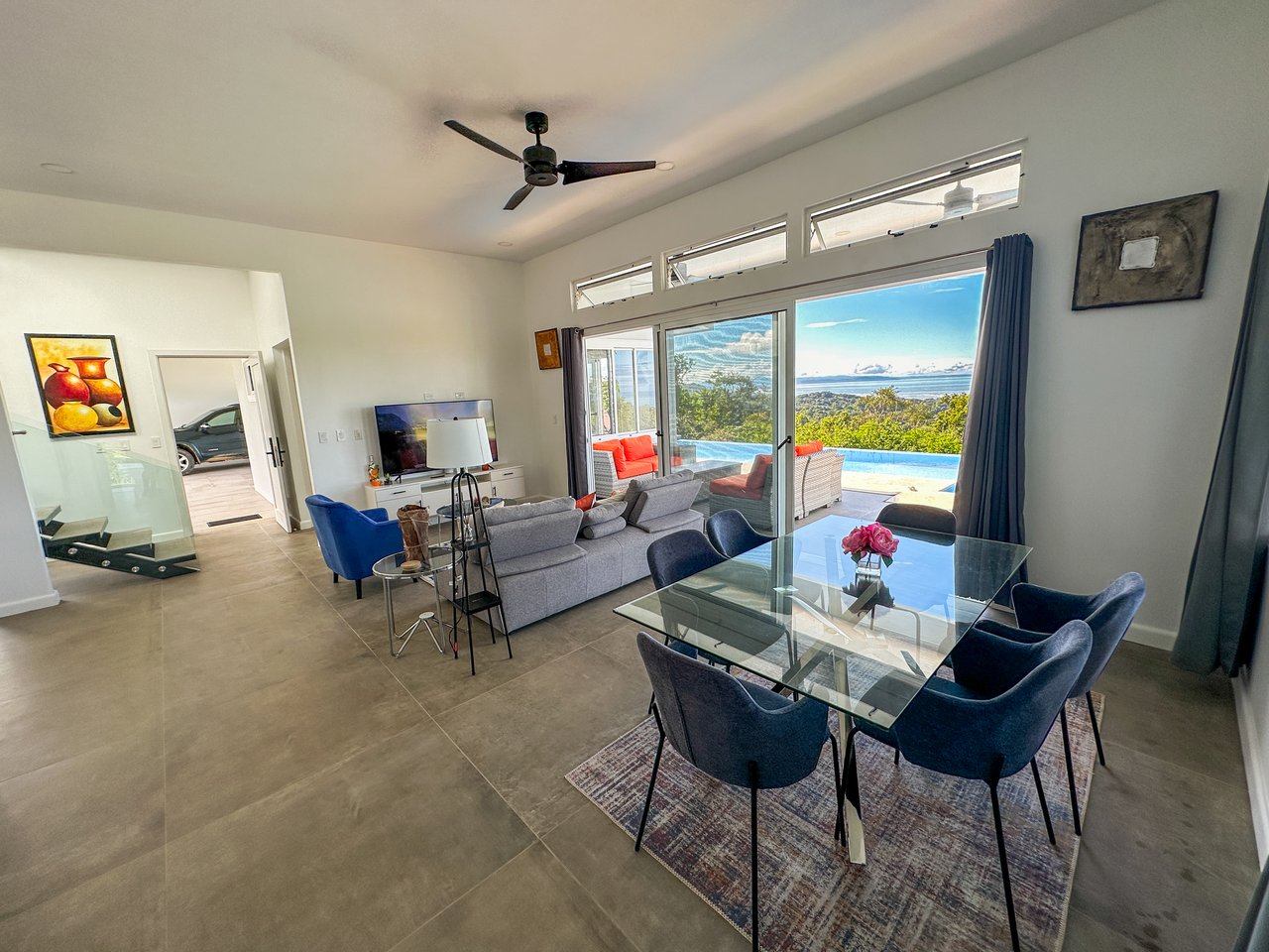 The home features three bedrooms + a den, seamlessly open living spaces, soaring high ceilings, and an airy environment. Large windows invite the natural light and splendid views which are visible from every room, nook, and cranny of the house. The living room, primary dining area, and the kitchen are designed for entertaining as they open up to the spacious terrace and infinity lap pool.
