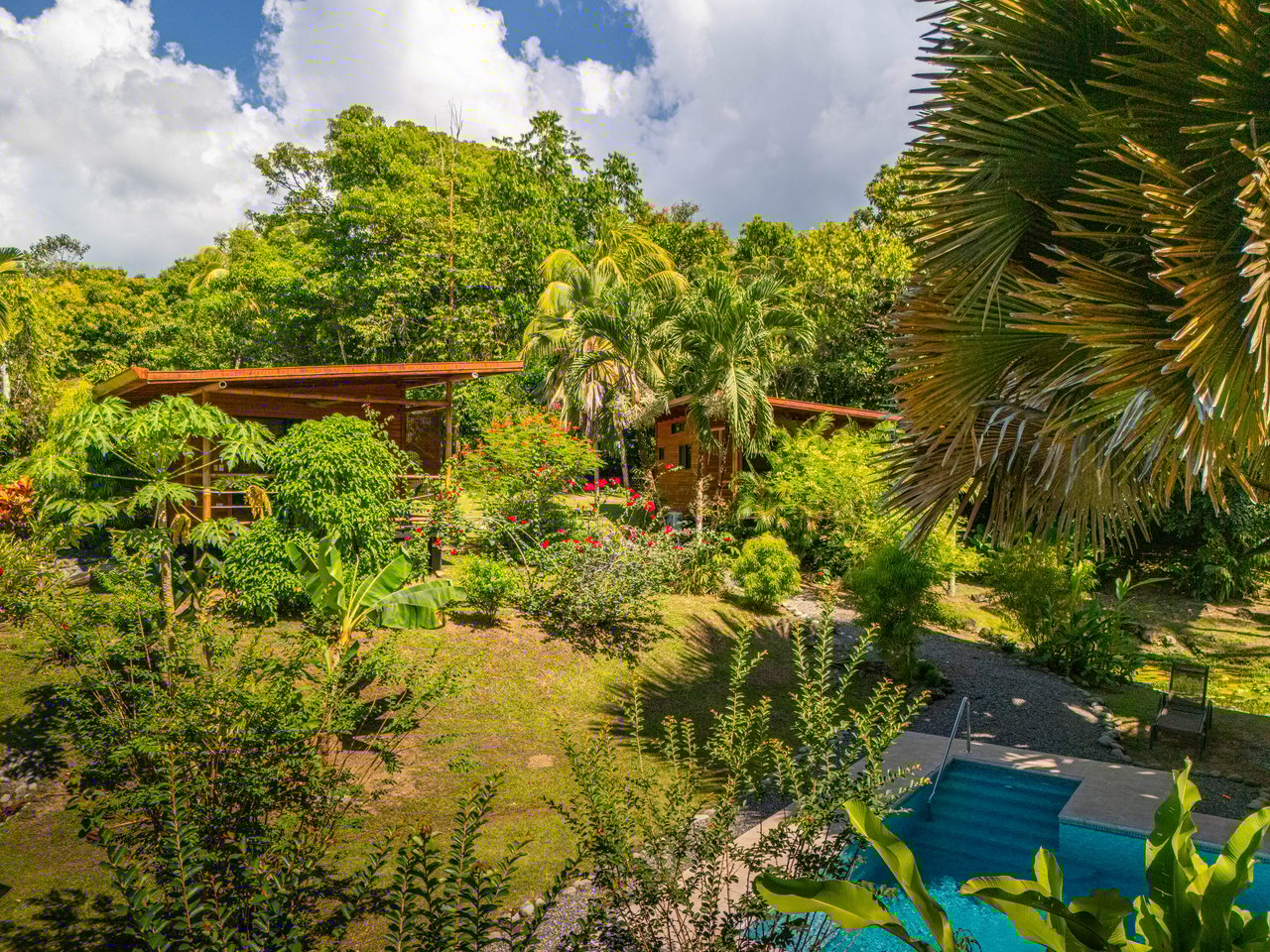 Buena Onda or Good Vibe accurately describes this amazing gem of a property ideally located in one of Southern Costa Rica’s most popular destinations. This tropical dream offers impeccably manicured gardens with numerous vantage points to enjoy its splendor; whether relaxing in a hammock by the river, meditating or painting the surrounding beauty on a platform above a Lotus flower pond or splashing around in one of the 2 pools there is no shortage of ways to lose track of time here. Buena Onda is an ideal property for the owners to live onsite and manage a small boutique lodge or offer longer term rentals as there are 2 separate pools (1 for guest and the other for the owners). Additionally, there is another building with a second private entry which could serve as a restaurant or be redesigned as additional housing. Or Buena Onda could be used as a personal home or retreat with distinctive homes to accommodate multiple families.