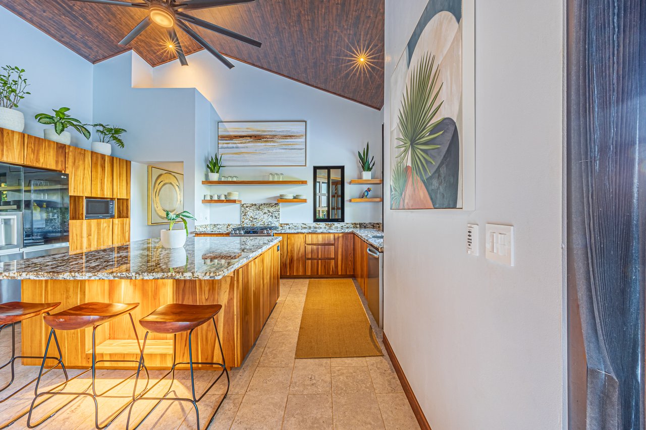 The entry to the home is magnificent featuring custom ironwork fences and a perfectly planted backyard oasis. The roof is such that it allows for one to stay dry whether you are coming in with groceries or enjoying the back patio. Enter through the oversized laurel front door equipped with a keypad to the home's entertaining delight. Large open concept with artesian guanacaste furniture, a large chef's kitchen featuring custom cabinetry with an oversized granite island and countertops. Enjoy the ability to fully open the accordion window above the sink to bring in those wonderful breezes. Hand-crafted teak kitchen cabinets and wall decor are just a few features of this wonderful space. A conveniently located half bath is easy access for entertaining featuring a guanacaste vanity.