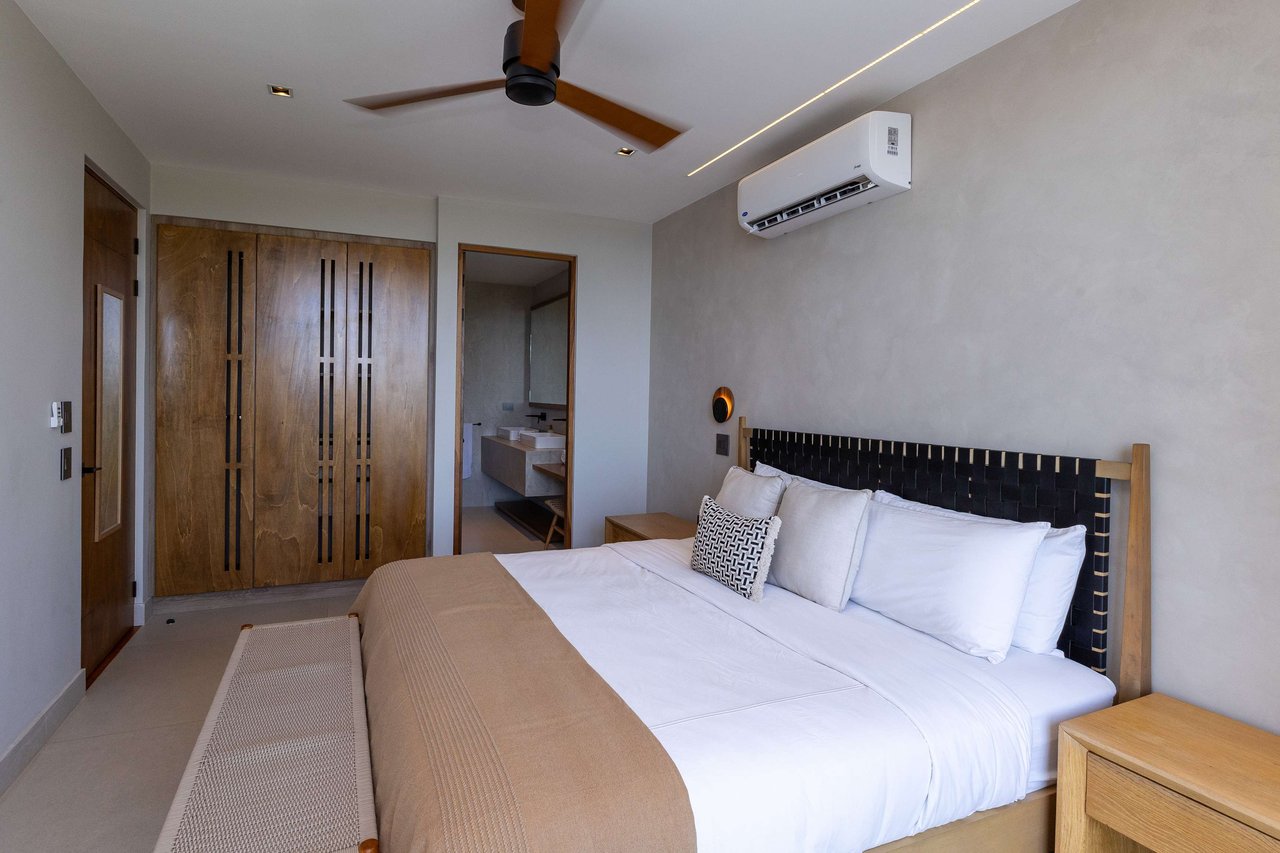 You enter the home from the elevated parking area via a formal antechamber leading to the first two bedrooms plus full laundry room, a large balcony, and a shared bathroom. One bedroom has two, built-in bunk beds for the kids. On the second floor you’ll find four other bedrooms, each with ensuite baths featuring white, handmade Spanish tiles creating a sophisticated texture repeated throughout with woven leather headboards, and wide weave linen pillows and bedspreads. Every room has a large closet with floor-to-ceiling custom-made wood doors, and an individual balcony with a pristine ocean view.