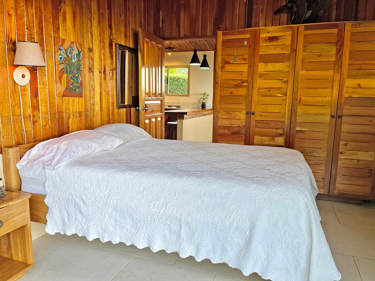 When you wake up in the master bedroom, you are greeted by the Pacific Ocean and the colorful jungle canopy. The abundant monkey and bird life (toucans, parrots, scarlet macaws, among others), the waves crashing on the beach, and the creek in the valley below… it is a soundtrack that you will enjoy for years. The sliding doors lead you out to the side yard and covered terrace. The second bedroom has the same jungle and ocean views from the window. It, too, comes with a custom-made hardwood closet.